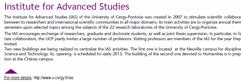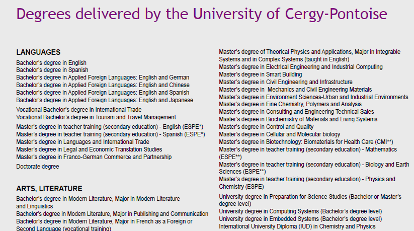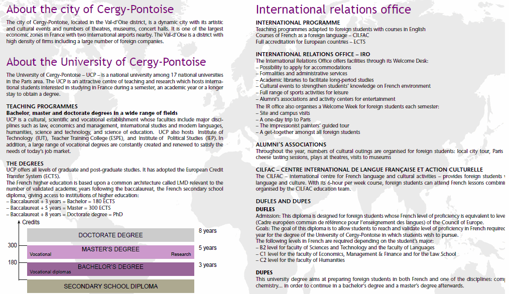 The University of Cergy-Pontoise – UCP – is a national university among 17 national universities in the Paris area. The UCP is an attractive centre of teaching and research which hosts international students interested in studying in France during a semester, an academic year or a longer stay to obtain a degree. UCP is a cultural, scientific and vocational establishment whose faculties include major disciplines such as law, economics and management, international studies and modern languages, humanities, science and technology, and science of education. UCP also hosts Institute of Technology (IUT), Teacher Training College (ESPE), and Institute of Political Studies (IEP). Every High school Chinese graduates can apply for entering this class from 2013. Most of the courses of this class are given in French. Cooperative school is Cergy-Pontoise University.