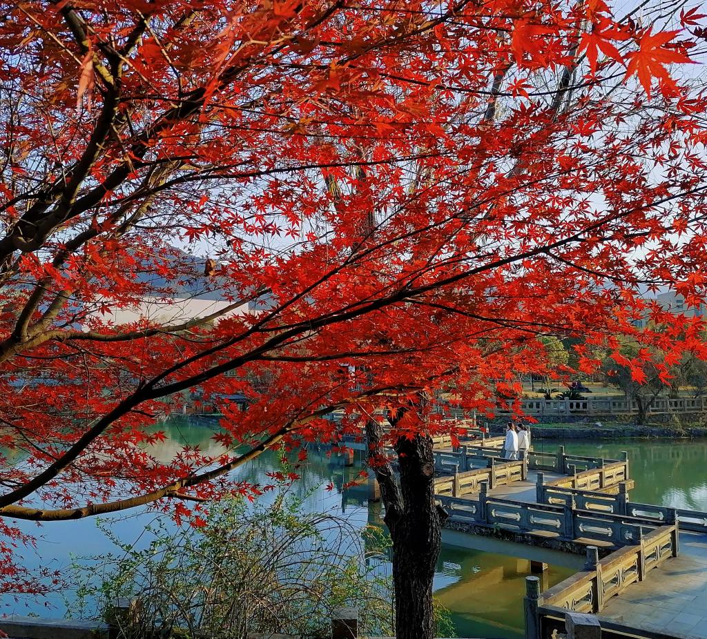 题:红枫霜迹浅,曲桥秋色浓