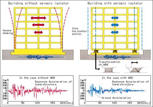 In addition to strengthening a building against earthquake shocks, engineers can actually reduce the force a building is subjected to. They install what are called base isolators, which isolate the base of the building from the earth's movements. Most are one of two forms. Some are like giant hockey pucks that squish and deform as the building rocks atop them, absorbing some of the energy of the shaking. Others are sets of two horizontal surfaces, plates made frictionless so that they will slide past each other. The building sits on the top plates, the bottom plates rest on the ground. When the earth lurches, only the bottom plates move, sliding back and forth under the top plates.