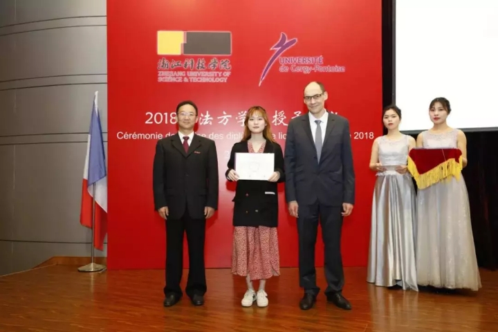 on April 13rd,the School of Civil Engineering and Architecture of Zhejiang University of Science and Technology held a ceremonious ceremony for the 2018French Civil Engineering (China France project) in the Xiao Heshan campus. Vice-president of Zhejiang University of Science and Technology Fengjun and vice-president of Université de Cergy-Pontoise Patrick COURILLEAU, French educational consul in Shanghai Fabien CHAREIX, the leaders of the cooperation project Fabien Bruno Fiorio, the leader group of our school, the teachers and students of the 2018 graduates, and the parents of the graduates from the civil engineering of the civil engineering, and the parents of the graduates participated in the ceremony. Yang Jianhui, Party chief secretary our School, hosted the ceremony.