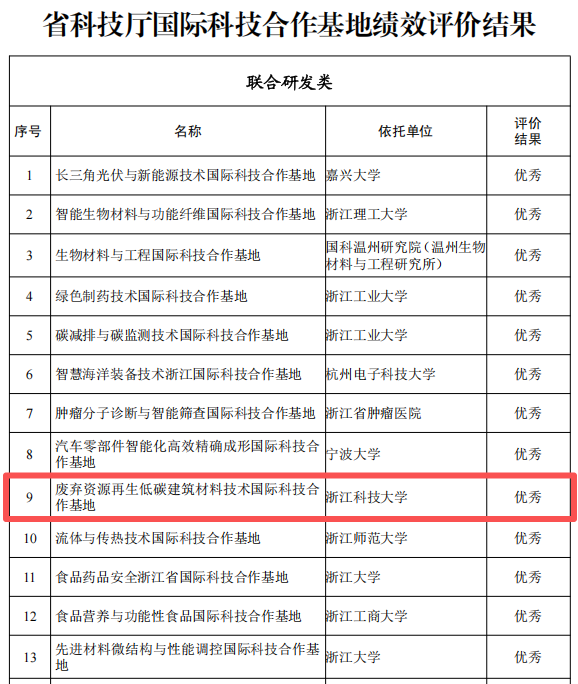 近日,浙江省科学技术厅公布 2023-2024 年度省级国际科技合作基地绩效评价结果,我院 “废弃资源再生低碳建筑材料技术国际科技合作基地” 获评 “优秀” 等次。